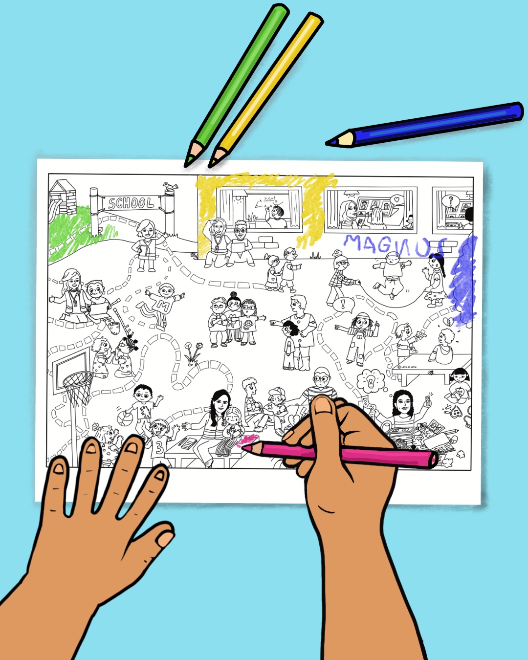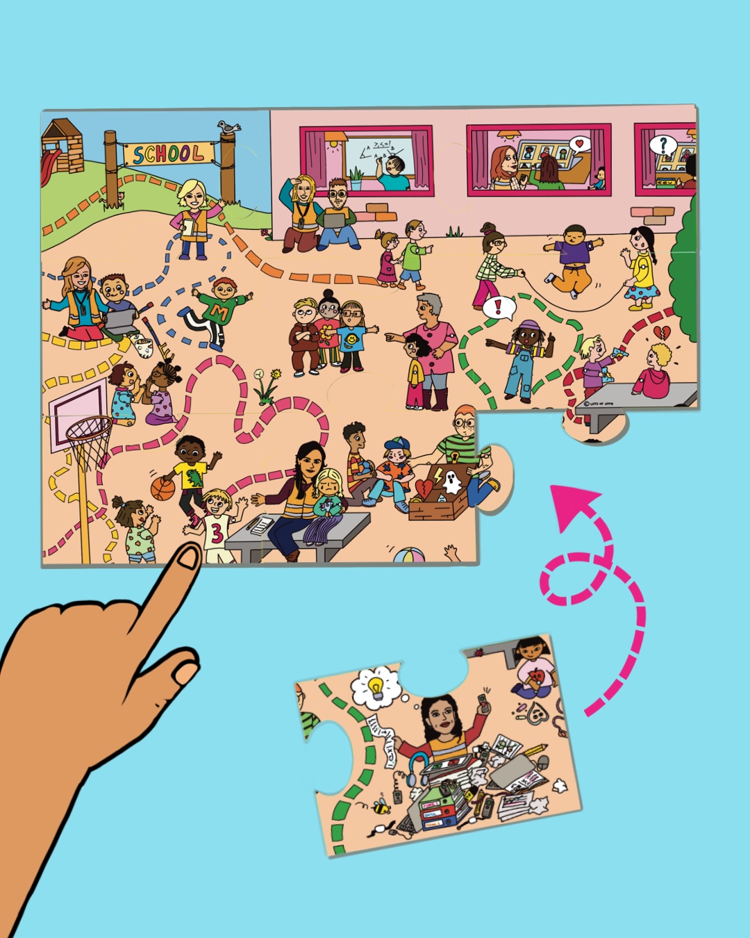 Toen al het veldwerk afgerond was, wilden ze graag terug naar die scholen om de kinderen te vertellen waar ze precies aan hadden meegewerkt. Viavia kwamen ze bij mij terecht met de vraag of ik illustraties kon tekenen die op een eenvoudige en kindvriendelijke manier het onderzoek toelichten. We dachten samen na en uit onze eerste brainstorm kwam het idee om het verhaal te vertellen aan de hand van een puzzel, waar alle stukjes samen zorgen voor het resultaat.